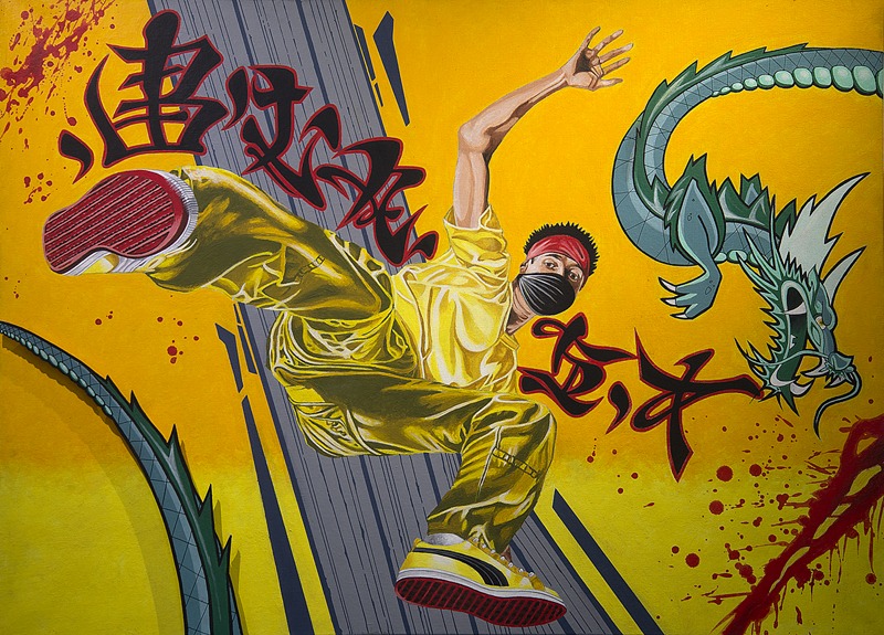 Dans cette composition, l’artiste poursuit sa recherche autour du mot Blast, dont les lettres se mêlent aux silhouettes en mouvement.