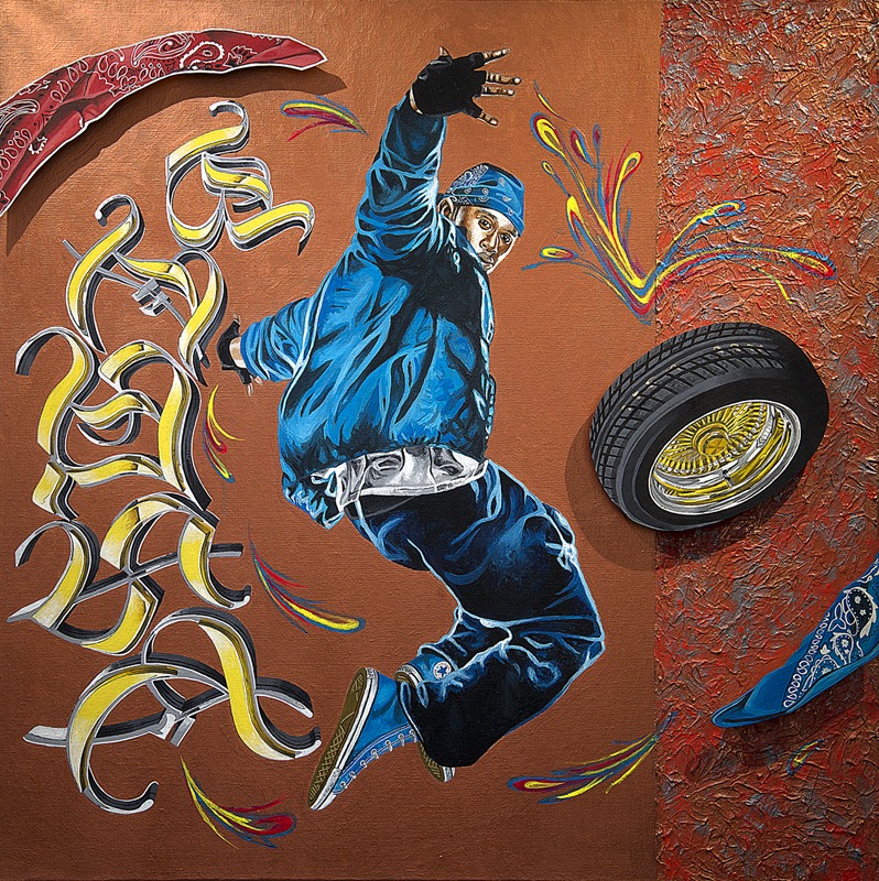 Dans cette composition, l’artiste poursuit sa recherche autour du mot Blast, dont les lettres se mêlent aux silhouettes en mouvement.